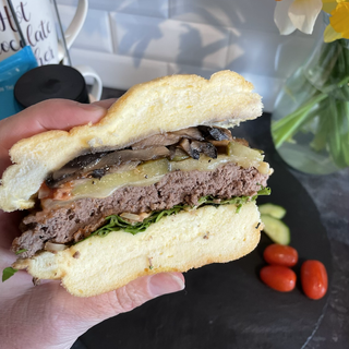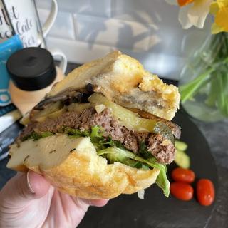 Chopped the lettuce and onions and gherkins whilst cooking and sliced my Big Homemade protein bun in half & melted the @eatlean cheese ..