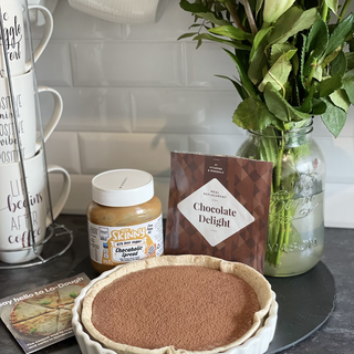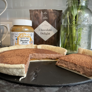 I just made a @lodough.co shell by popping it in a tart dish for a couple minutes in oven to go crispy, ( 39 calories & 2.2g carbs) then topped with @skinnyfoodco salted caramel spread ( I used 20g so it was 106 calories & 10g carbs ) and made the @exantediet chocolate delight(204 calories & 17g carbs) and popped it on top !