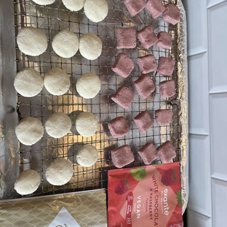 For the dark chocolate ones I melted 40g no added sugar @aldiuk dairyfine chocolate in the microwave, then I dipped each “chocolate” into it and sprinkled my freeze dried Rasberry on top ! And put on wire rack in fridge to set ( the coconut ones I did the same but sprinkled coconut on !