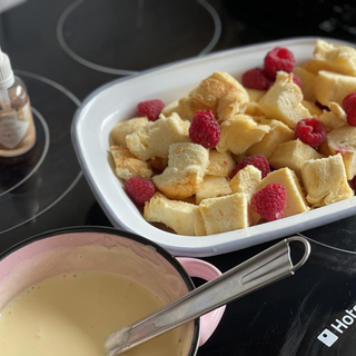 Evenly arrange the “protein bread”cubes in the prepared baking dish. With the raspberries too , I added small dollops of @skinnyfoodco co raspberry & white chocolate in a few areas too ! ( I used 10g in total in small blobs ) Then I Poured the egg mixture over the bread, being sure to completely moisten the top layer.