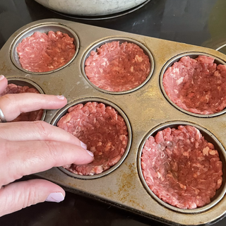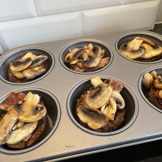 I used a muffin tray to cook individual “burgers” I cooked 25g 5% lean mince in each one ( 38 calories) , then once nearly cooked, I drained any fat , then layered with some chopped cooked mushrooms( one on each (10 calories), chopped cook bacon (1/2 slice in each 30 calories ) and cracked a small Egg ( 54 calories & 0.2g carbs ) on top and put back in oven until cooked ..