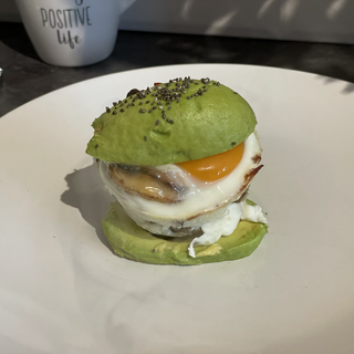 Avacado , bacon, mushroom & egg Burger for Breakfast today !!